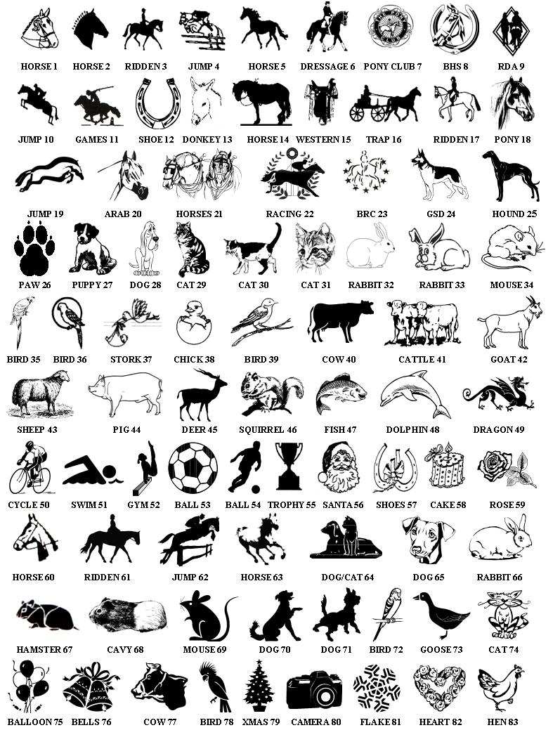 FREE STOCK CENTRE MOTIFS We hold a wide variety of free picture logos and text ready for use on the centre printing of our rosettes and badges. These can be included with your own personalised text at no extra cost, and with a selection depicting most sports, subjects and occasions will enhance your rosette awards. Your own logos and company artwork can be reproduced onto a metal printing block for promotional rosettes etc. There is a one off charge of £25.00 for producing a personalised block, which remains your property at all times for sole use with your orders. We are adding new motifs all the time so please ask if you do not see what you are looking for.